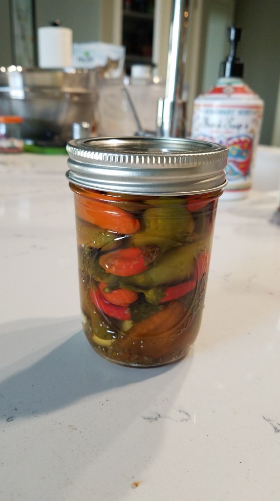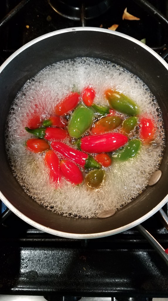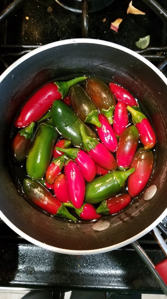 I followed a combination of recipes that involves mostly vinegar, salt, sugar, and spices to form the brine. The pickles are boiled in the brine for about 10 minutes until softened. I also added some Mexican oregano and garlic into the jar before adding the peppers and brine for an extra hit of flavor. I like this recipe because it adds a nice acidic kick and infuses the peppers with some sweetness and seasoning and mellows the spiciness nicely. I made half a recipe for this batch, and there was some leftover brine because I really packed the jar.