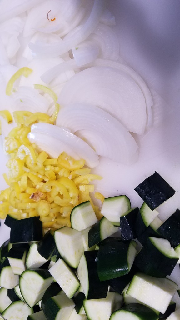 - Prepare vegetables by slicing the onion in half, removing skin and outer layer if needed, and slicing into ¼ inch slices. For the zucchini, cut off both ends, cut into quarters, and cut the quarters into large bite-sized pieces. For the peppers, cut off the stem end and cut the peppers in half lengthwise, remove the seeds and white membrane, and cut the halves into slices.