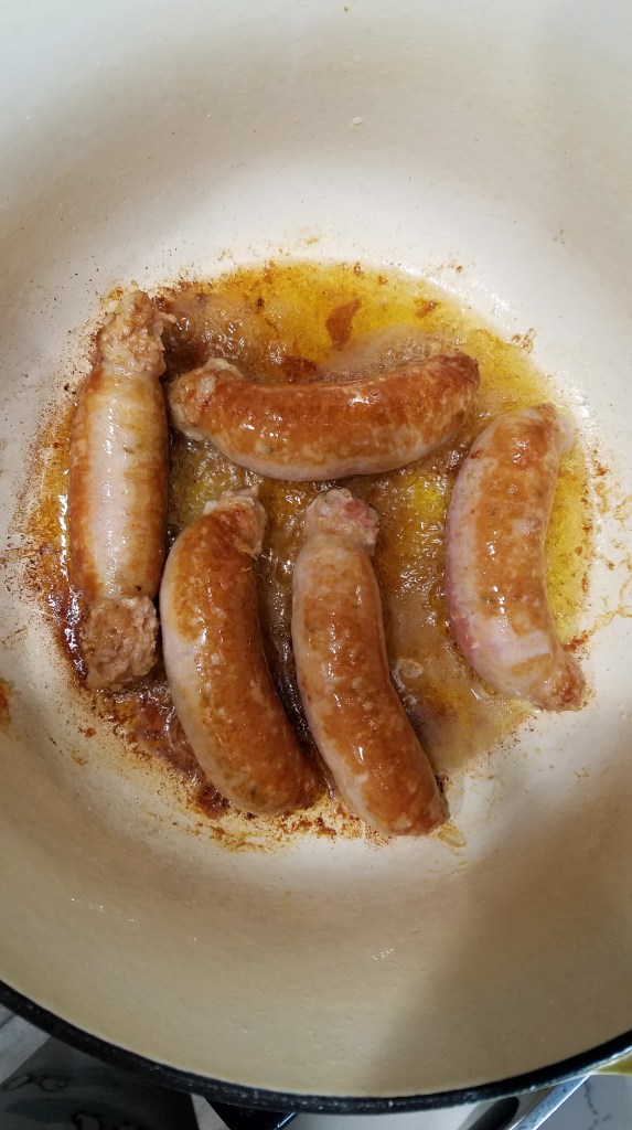 - Using tongs, add sausage to the pan, rotating occasionally until browned on all sides. When fully browned, use tongs to remove them from the pan onto the plate with the chicken. Set aside.
