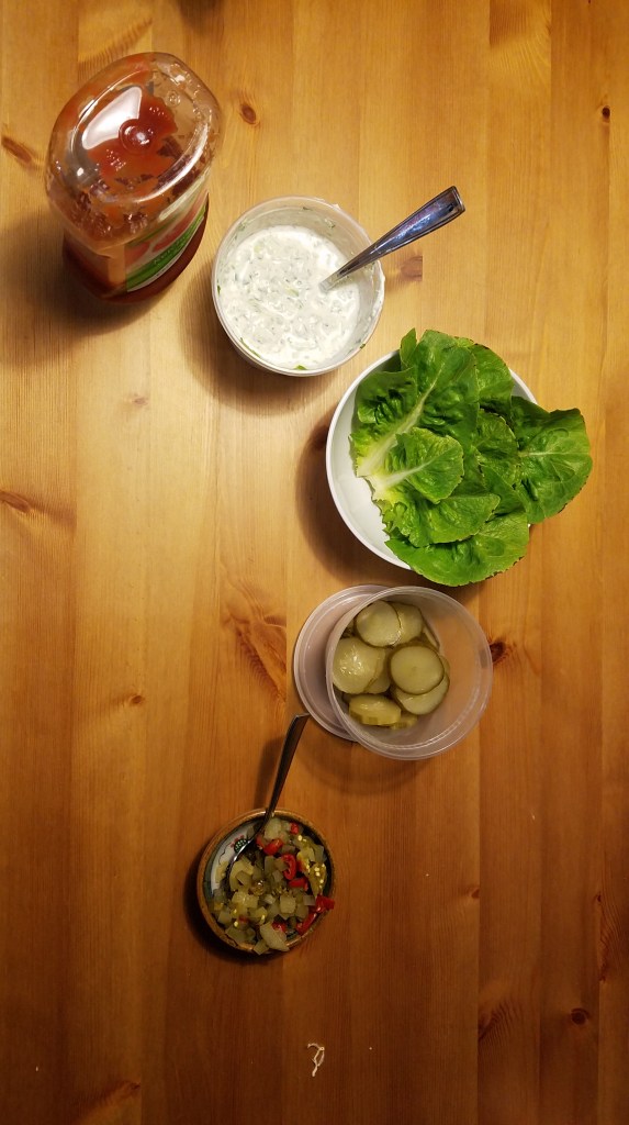 Toppings! Relish, pickles, lettuce, Tzatziki
