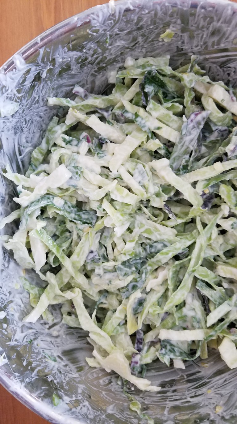 For the coleslaw, I used what I had, considering that we ran out of all vinegar options in the house (this situation had since been remedied). I went for a lemon, Greek yogurt, and herb combo, which turned out really nice! Flavors were super fresh and complimented the cabbage well. This dish made me feel like I was at a nice backyard barbecue, instead of perpetually quarantining in my house. I served this with home made chicken nuggets, but this would also work well with grilled meats or even fish. The Greek yogurt base made this feel light and healthy while still being nice and creamy (no mayo here!), so go ahead and make some coleslaw if you have a cabbage kicking around in the crisper drawer.