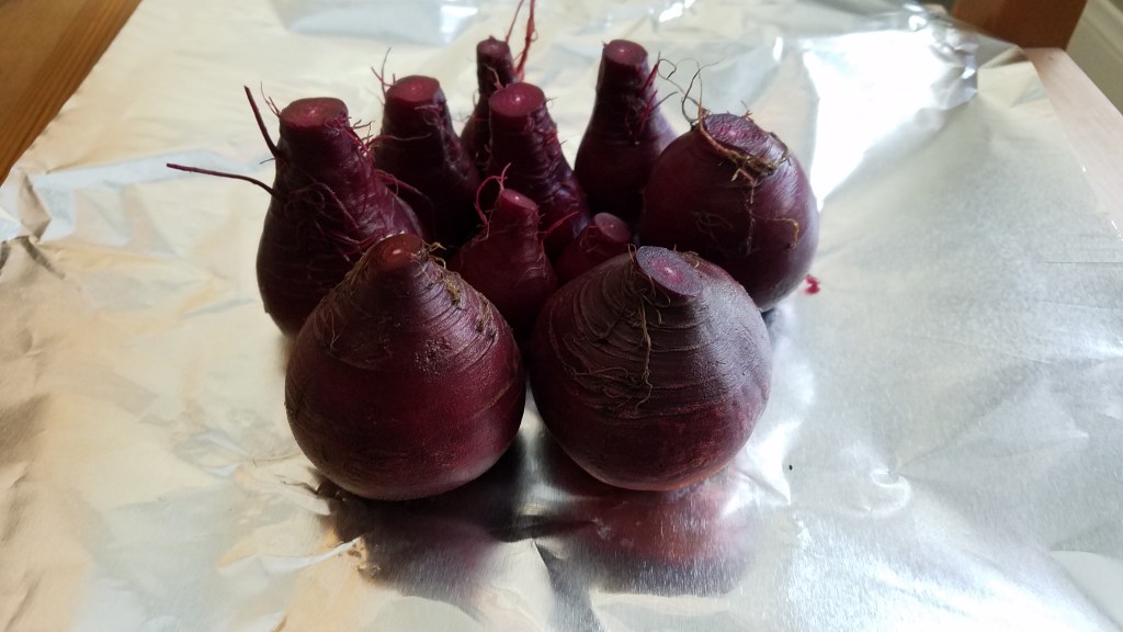 Roasted beets take a little time, but this method maximizes the sweetness and results in a very versatile product, with beets that will be ready for salads, pickles, or snacking at a moment’s notice. All you need is a knife, oven, and some foil to make this work – along with about 2 hours of hands-off cooking time. I try to make big batches if possible, so this is a great meal prep option for beets all week.