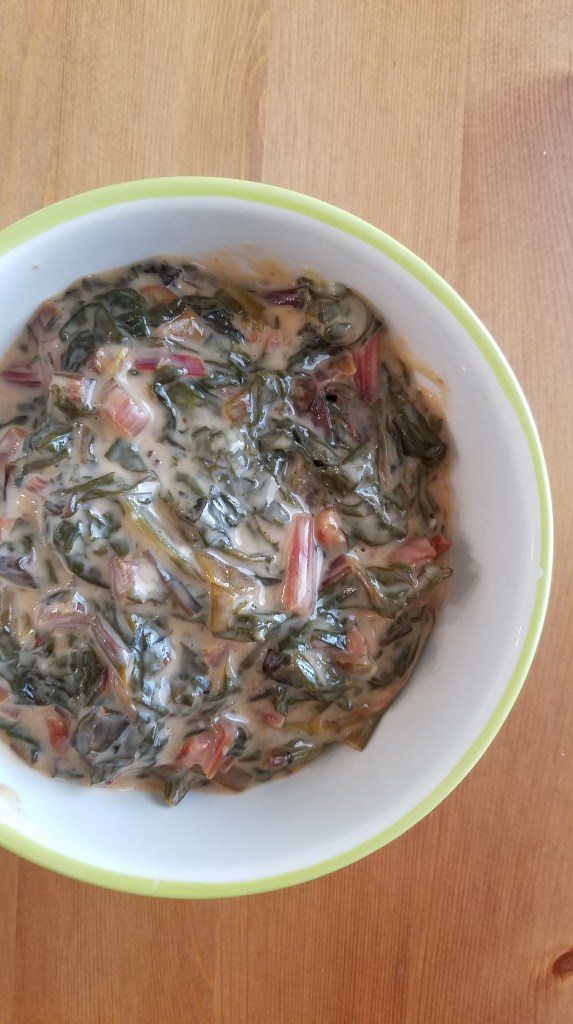 Mac and cheese – but make it greens. I have had this vision for a while as we were harvesting bundles of chard from our garden and bringing home loads of beet greens from our produce boxes. Ever since quarantine started, I have been craving cheesy, comforting foods. I thought about making creamed chard, but over time this idea evolved to mac and cheese greens – simmered down greens in a mac and cheese sauce.