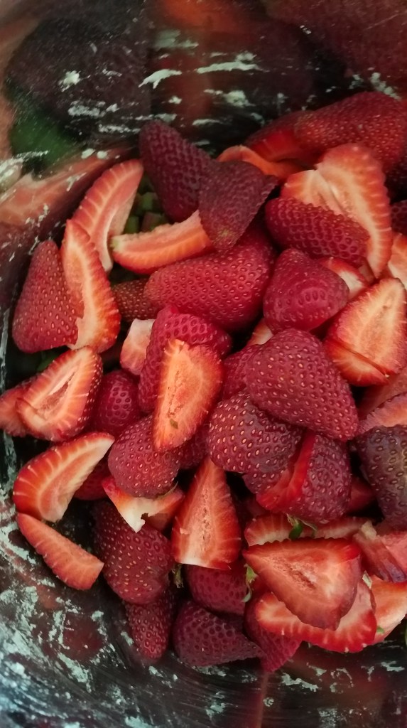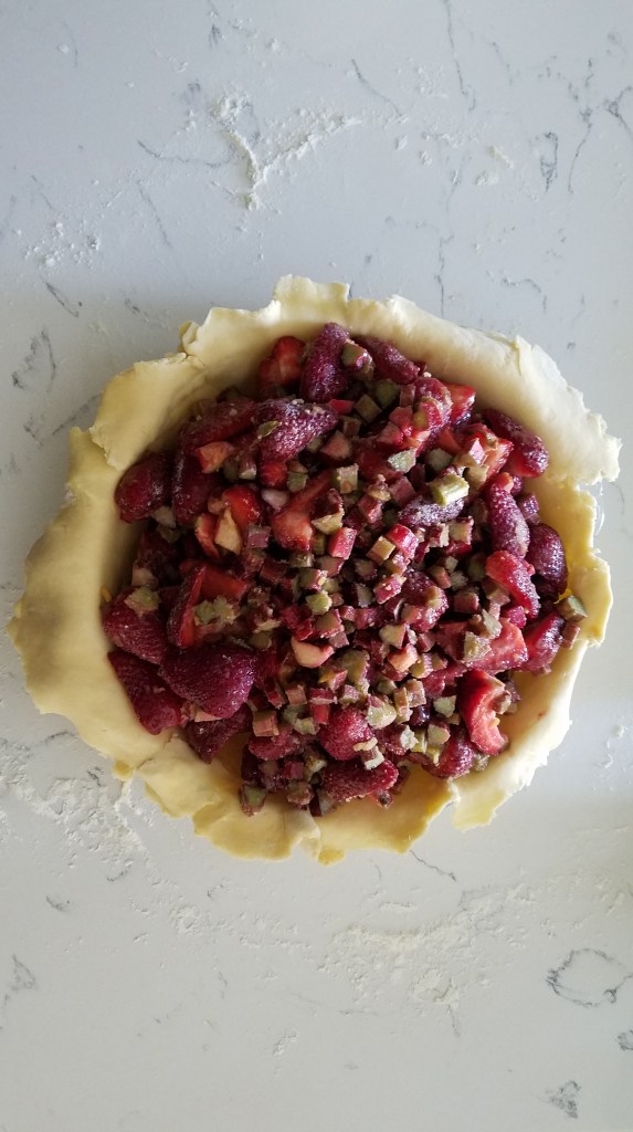 Chris has been craving rhubarb ever since the weather has gotten warm, and we finally saw some at the Farmer’s Market this weekend and made the plunge. We also bought a case of beautiful Santa Barbara strawberries, and set out on a pie making adventure.