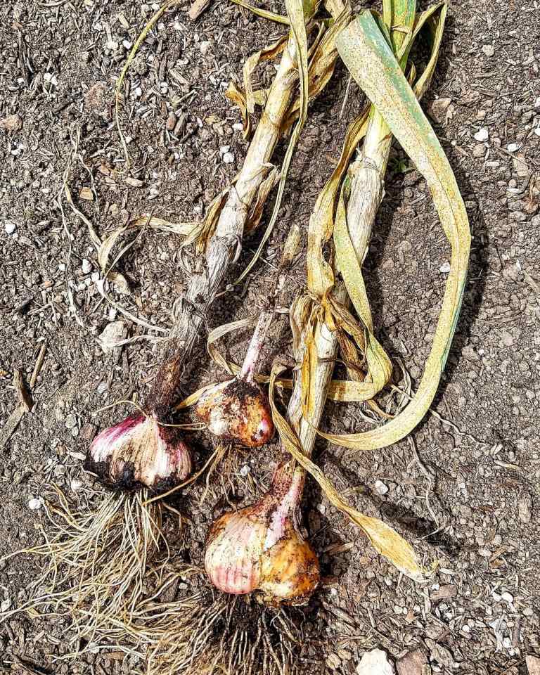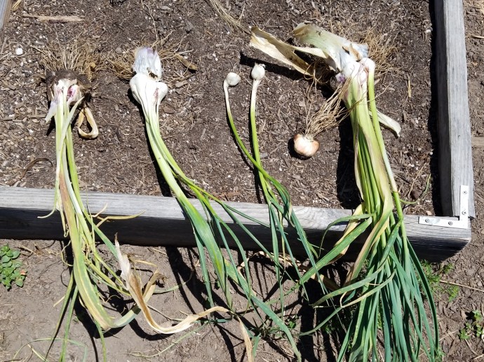 The garlic sprouted and grew over the course of the winter, and for the most part resisted being munched by gophers from below and rabbits from the top. We lost a few of the starter cloves that we put in, but our resulting harvest was more than enough. We pulled out four very perfect new heads, and three that we definitely kept in the ground for too long that had re-sprouted into what we refer to as “super garlic”. Garlic is supposed to be harvested when the plant dies back, which never really happened with our super-garlics, as some of the outer cloves just kept growing! Not ideal, but we learned for next year.
