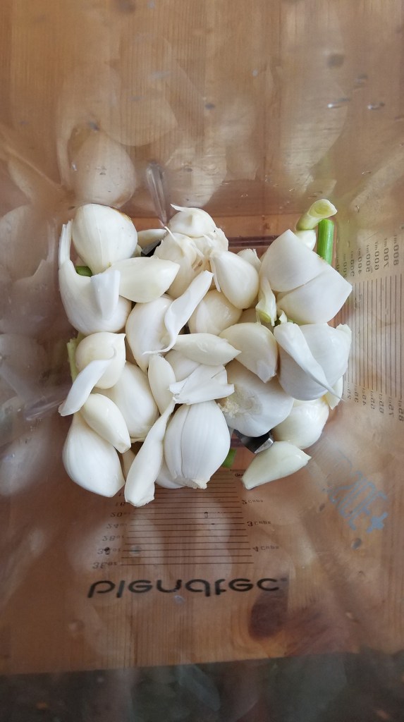 Peel 40-50 garlic cloves. Place in blender.