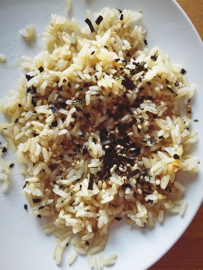 Warm, buttery, full of savory/umami flavors – buttered brown rice seasoned with furikake has been my quarantine snack of choice.  Every time I make rice, I set some aside for my future snacking self.  It completely satisfies my cravings for warm, savory carbs every time.