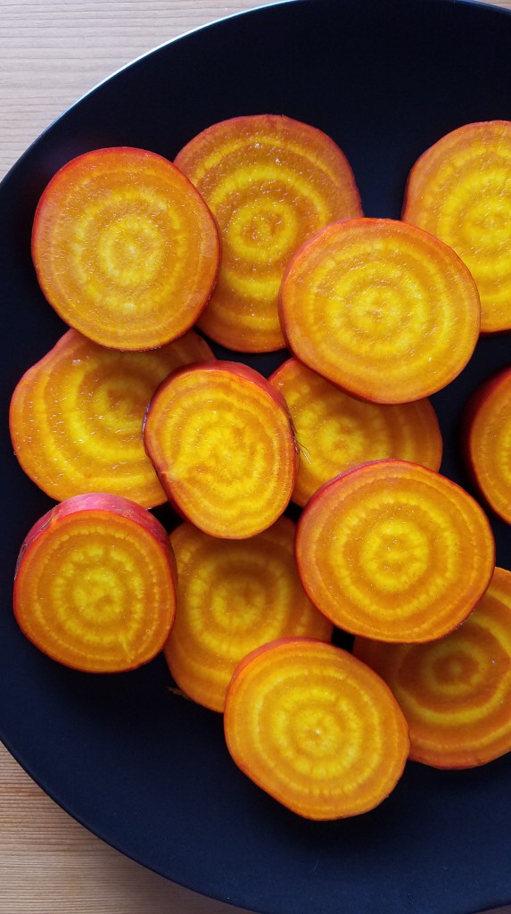 First of all, these beets are huge and so heavy! These are very substantial, and they have made it to several meals so far (and I only got three to begin with). The insides are absolutely gorgeous – incredibly vibrant yellow and orange rings. They did stain my hands, knife, and cutting boards yellow for a bit, but it all washed out eventually. Just think of the insane vitamin content that are in these – the Vitamin A and beta carotene content must be quite high based on this intense coloring.