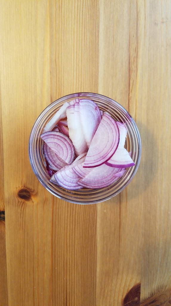 - Slice the onion by cutting into quarters (lengthwise, through the root end) and slice into thin slices. Place in a small bowl, and add vinegar, sugar, and salt. Stir to combine, and allow to pickle while you make the rest of the recipe.