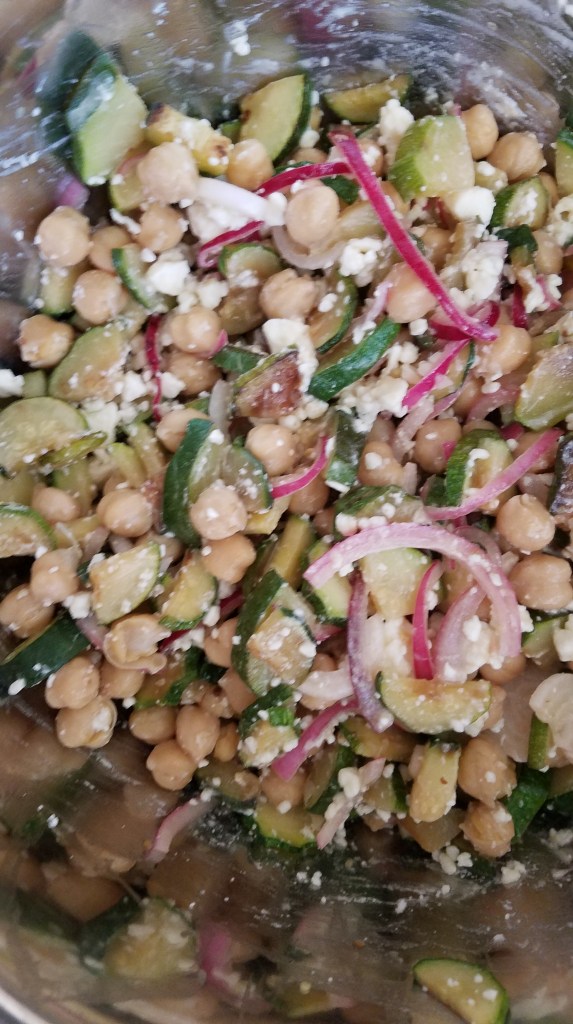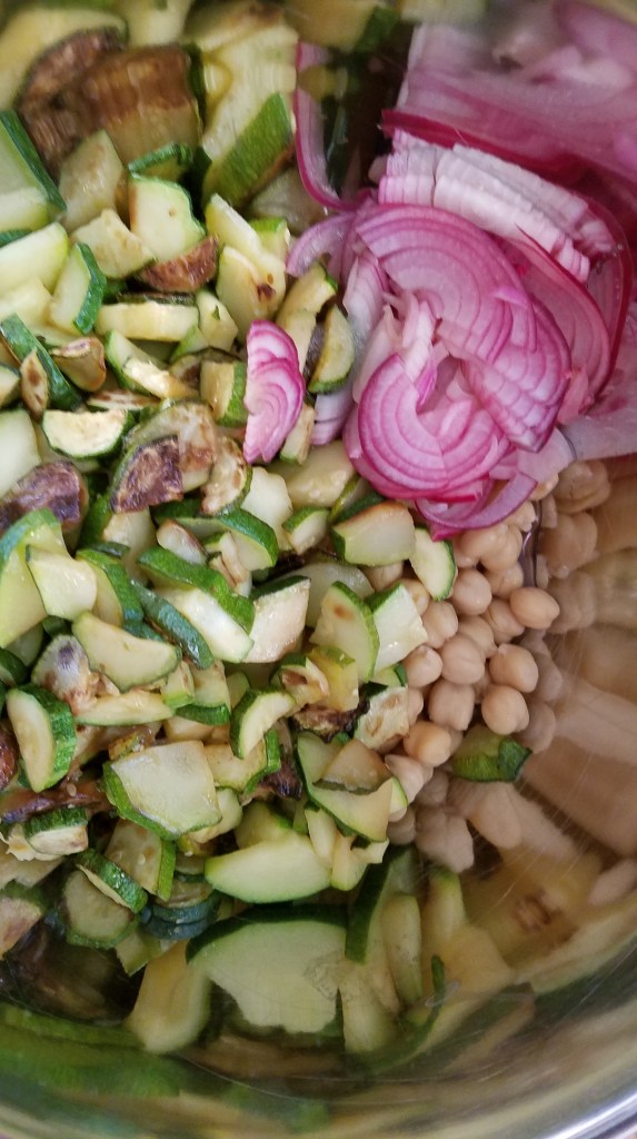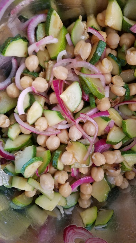 Pickled onion with brine, zucchini, and chickpeas in the bowl!