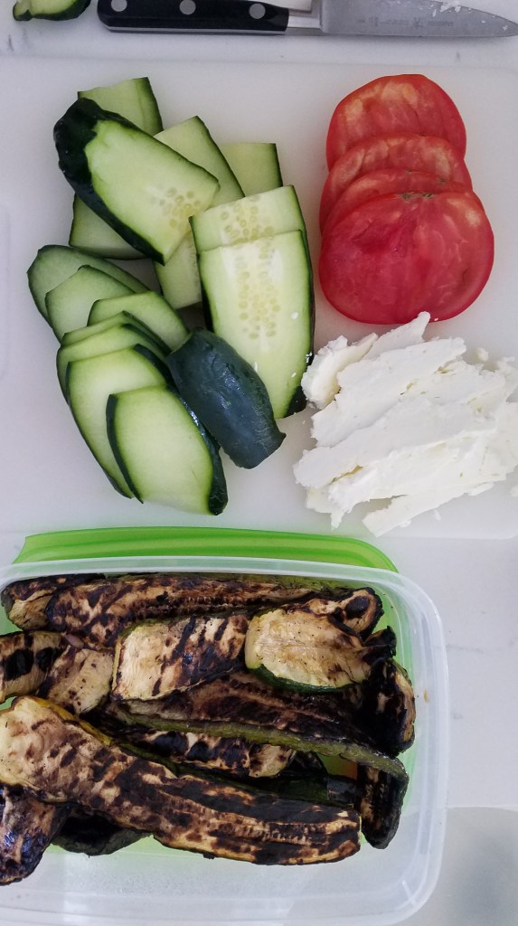- Stack thinly sliced grilled zucchini, fresh tomatoes, and fresh cucumbers on one half of the flatbread. Season with a sprinkle of salt.