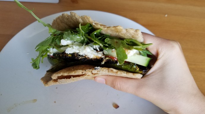 The filling was an excellent assortment of fresh and grilled veggies, sliced thin to pile high! I used some fresh cucumbers, tomatoes, and arugula, along with some grilled and marinated zucchini that we made last night. I also sliced some feta into thin pieces (using the block feta, although the crumbles would work fine as well!) to add that briny, salty, cheesy note that I love. I topped off my veggie pile with a little drizzle of local olive oil and balsamic vinegar, just enough to flavor the fillings but not too much to have a mushy sandwich. Once the sandwich was piled high with my veggies and cheese, I folded over the top of my flatbread to complete my sandwich. Fresh bread, salty cheese, in season veggies – such a perfect combination.