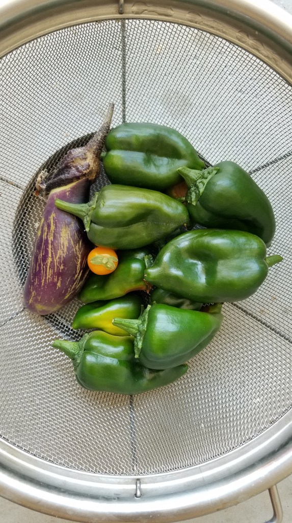 Lots of poblanos, an eggplant, and a sungold tomato.