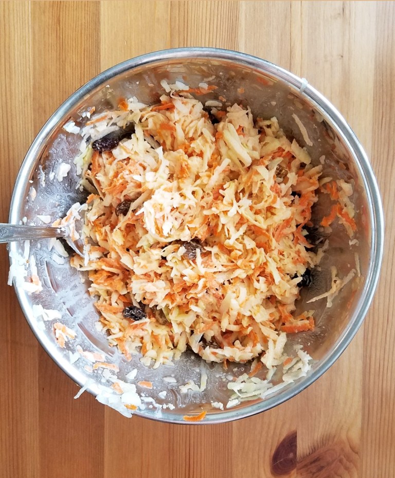 - Use a large spoon and mix to combine the kohlrabi, carrots, and raisins with the dressing.