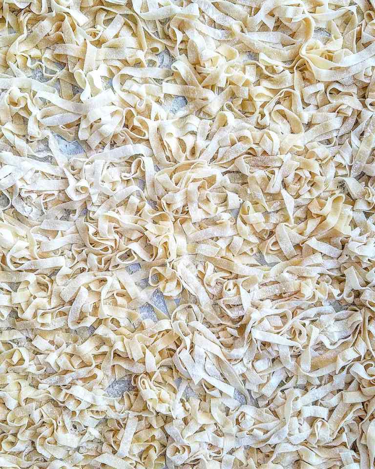 I spent about 2 hours working on my pasta, rolling the dough out and cutting it into ribbons using my machine. It’s not a fast process but I found it very therapeutic, constantly rolling, flouring, and eventually making pretty home-made noodles. I do think the home-made pasta is worth the effort compared to the store-bought box stuff, and I would definitely recommend this if you need a nice food project for the weekend or evening in quarantine.