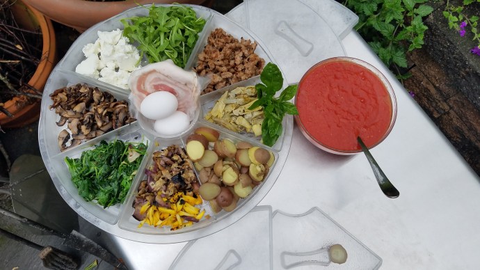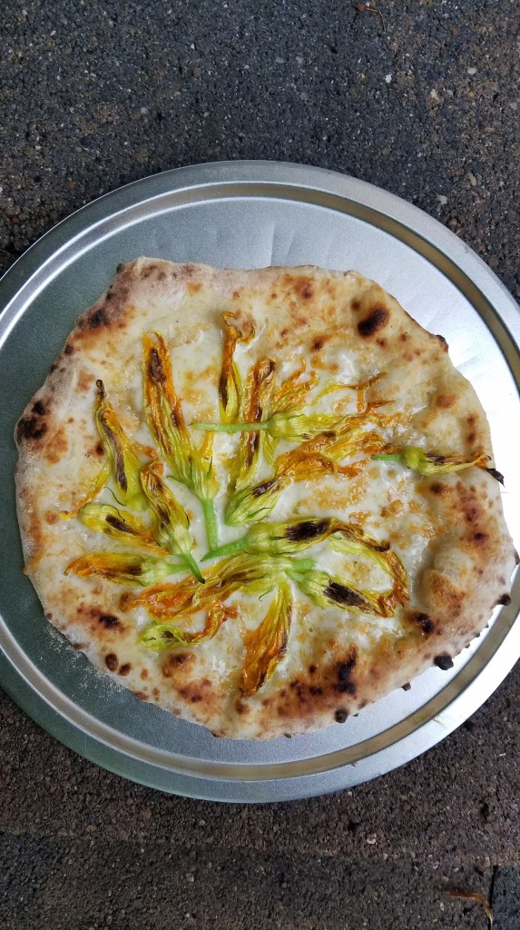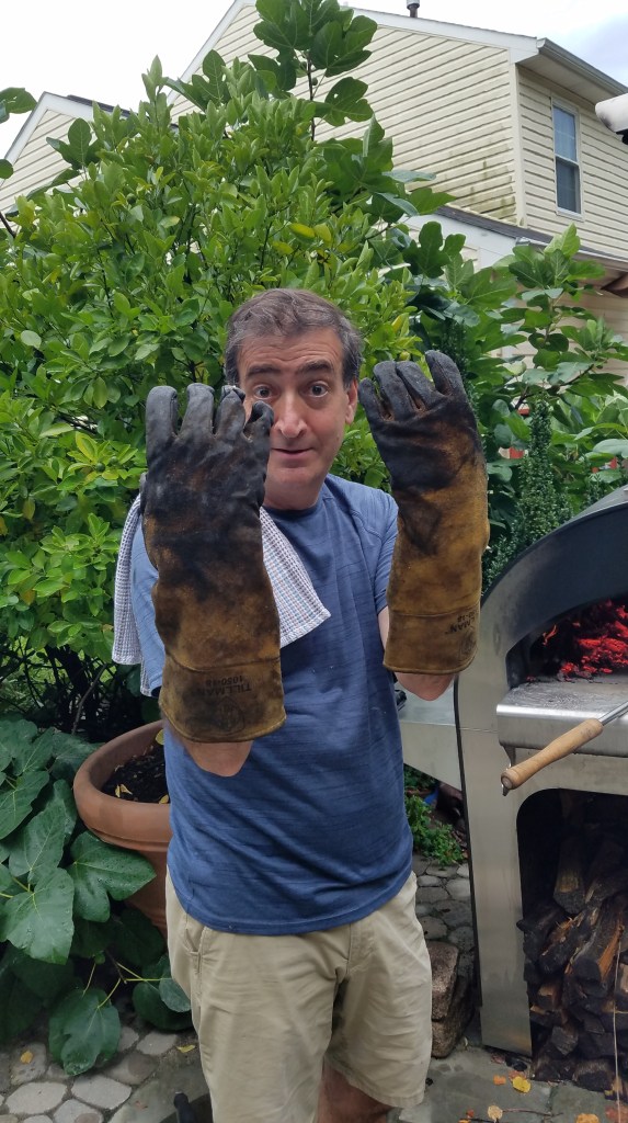 Step 1: Set up the fire! To do this, my Dad builds a stack of larger logs (Jenga style) with some smaller sticks going up the middle and paper at the bottom/surrounding the pile. Note that all the wood should be as dry as possible – if you live in an area where it rains a lot, my Dad suggests leaving dry wood in the oven for next time, or storing wood indoors.Step 2: Light it up! My Dad uses a lighter to light the paper. The smaller sticks should catch next, followed by the larger logs.Step 3: Allow the fire to grow and ensure everything is igniting fully. You can see at the temperature gauge that even though the fire is fully burning, the oven itself is not hot enough (only around 200F). Step 4: Fully heated oven! All of the logs are burning nicely, and the temperature of the oven is up to 800F or so. This stage takes about 10-15 minutes of heating. Step 5: Move the fire! My Dad has a tool that looks like a large hook that helps sweep the burning logs off to one side. The tool is necessary to do this safely, so if you don’t have one, get one! Link to something similar here.Step 6: Sweep the ashes! My Dad uses a wire brush with a long handle to do this. Sweep the entire floor of the pizza oven by moving the ashes over by the rest of the burning coals, and sweep the front ledge as well to keep everything neat and to prevent ashes from getting on your pizzas during entry/removal. Again, if you don’t have a brush, the link in Step 5 has a similar option.My Dad recommends getting a good pair of welding gloves for these steps. They help protect your hands and arms, remember: these things get hot!These are the ones he uses and likes. Not sponsored obviously, just a word from a fan!Step 7: Swept, hot, and ready to cook! You can see that the coals are all burning nicely off to one side, while the oven is around 800F, with plenty of cleared working surface for the pizzas in the middle.Step 8: Bring out your toppings caddy! You all have one of these, right? If not, bowls and plates will totally work. Either way, it’s best to have all ingredients ready to go for pizza time, especially if throwing a pizza party or entertaining. That way, you can focus on the assembly, cooking (and eating!) of the pizzas as you make them throughout the evening.Step 9: Start making your pizzas! I’ll post another post for some fun pizza ideas shortly.Step 10: Bake! We usually make one at a time and ideally eat it right away while it’s hot and fresh. Then we go back to make more! Key tips: Be sure to rotate the pizzas as they cook using a pizza peel (a metal one for this application, please!). This way you’ll get even cooking and browning, as the side that is closest to the fire will cook/brown faster. Keep an eye on it and don’t walk away, the pizza will be done cooking in 2-3 minutes (it’s super fast!).Step 11: Pull out your pizza, slice, and enjoy! Repeat with new toppings until full!