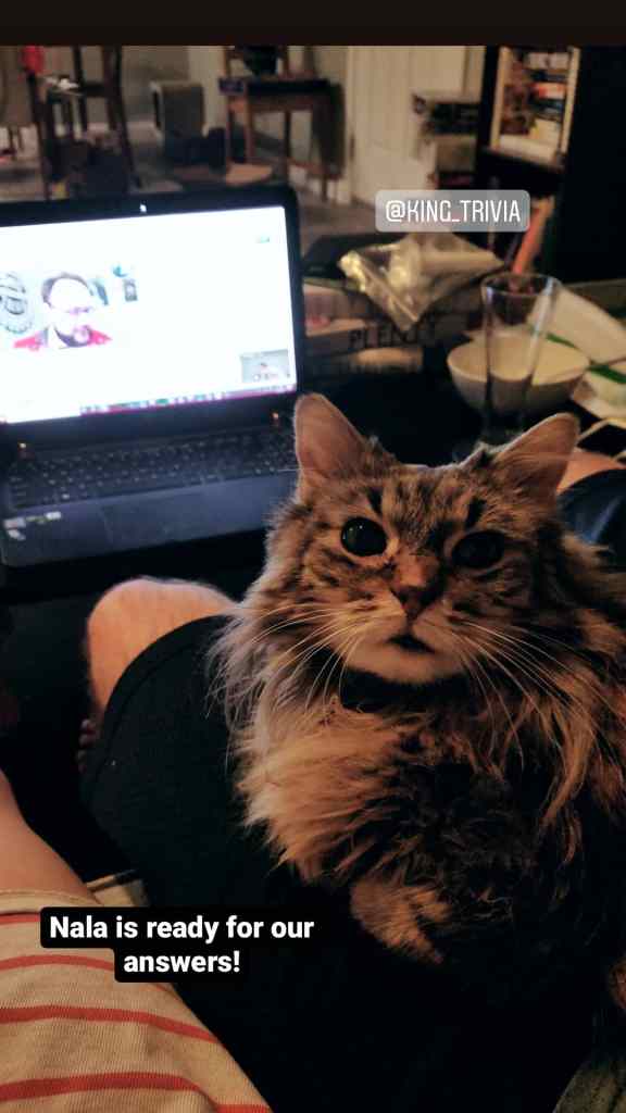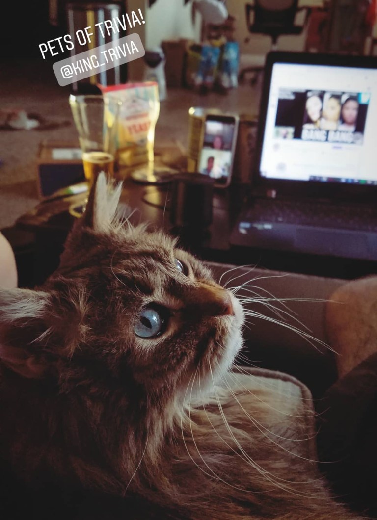 Another fun thing that King Trivia does is a pet picture segment! We tend to submit pictures of my cat, Nala, playing Trivia with us, which gets a fun shout-out on the stream. Pictures of Nala playing Trivia below and up top!