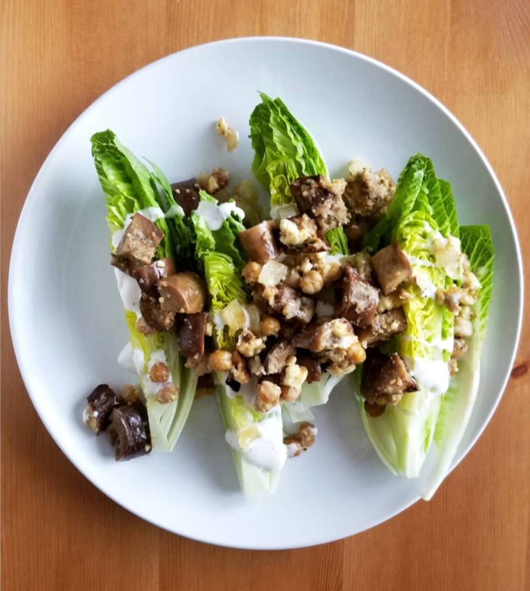 - Top the lettuce with the roasted eggplant. Drizzle with Caesar dressing.