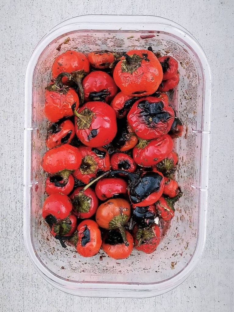 - Once starting to char, take the peppers off of the grill and add them directly into the marinade. Add the lid to the container and shake around to toss the peppers into the marinade. Keep the lid on the container and allow the peppers to steam in the marinade to continue cooking the peppers through until fully tender, about 15-20 minutes.