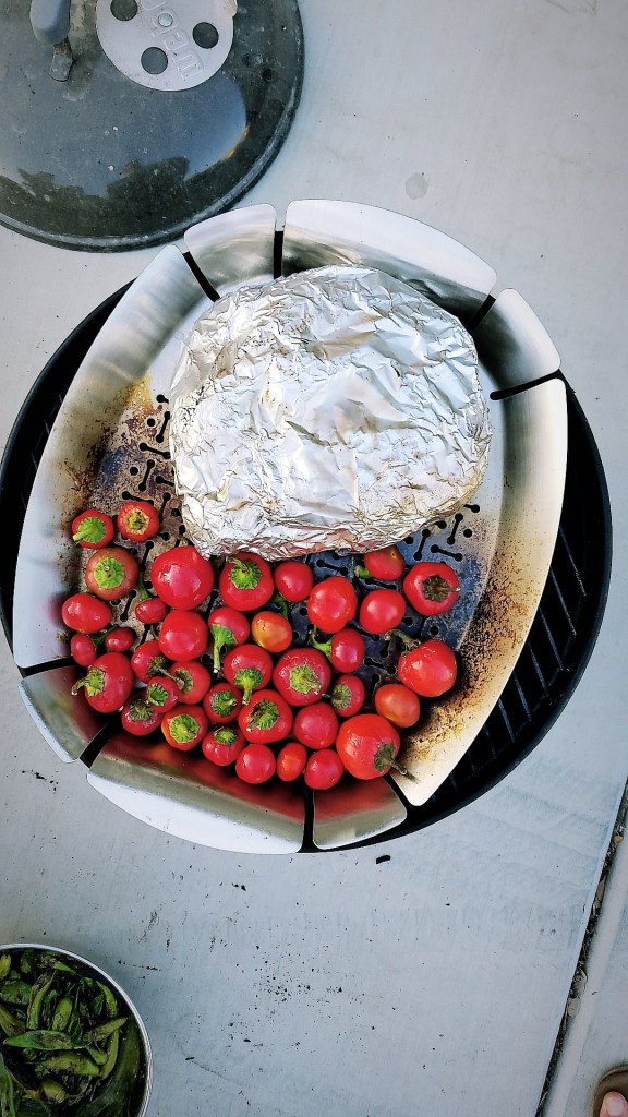 - Pre-heat a grill until very hot, and add the peppers to the grill (a grill pan may be needed for these, especially if the grates on your grill are wide as these peppers are pretty small). Toss occasionally until the peppers start to char slightly on the outside.