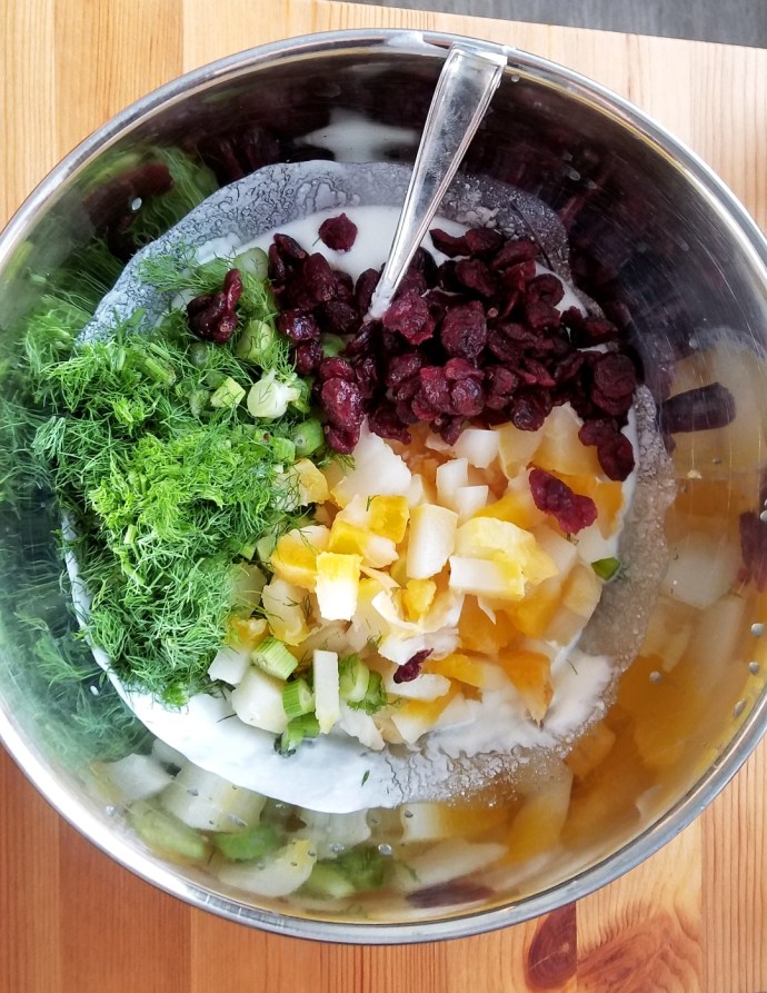 I decided to dress this one up with a little fall spin, by adding chopped butternut squash and cranberries to my usual base. I also added some chopped fennel fronds for some color, flavor, and crunch. There is no pumpkin spice in this, so rest assured that this dish is lemony, fresh, and full of chicken-y flavor – I’m not here to have my chicken salad taste like a latte.