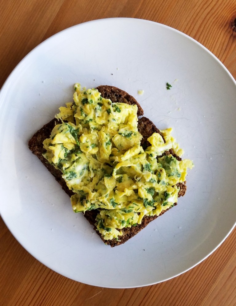 I’ve been trying to incorporate more parsley into my diet because it’s incredibly healthy (loaded with antioxidants and vitamins), and our parley plant is really taking off. Eggs and herbs go wonderfully together, and you can add a lot of herbs to scrambled eggs before it becomes overwhelming. I balanced out the green, grassy flavors of the parsley with a subtle pinch of truffle salt, which adds that awesome, mushroom-y umami factor that I love with eggs. This flavor combination elevated a simple egg toast to an almost-luxurious level. I ate this with a big handful of pomegranate seeds, but it would be delightful paired with a large side-salad, fruits, or other breakfast items (sausage and bacon included).