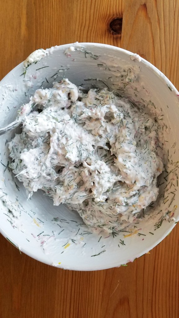 - Add cream cheese and salt to the bowl with the radishes, dill, and lemon zest. Mix until thoroughly combined.
