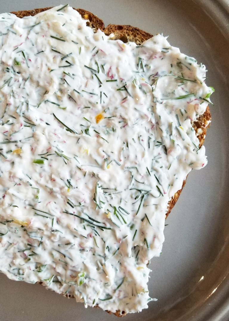 I made this recipe over the weekend, based on my recipe for Radish and Chive Dip, which may be one of my favorite recipes of 2020. This version is fully loaded with radishes, dill, and lemon zest to create perfect speckles of red, yellow, and green throughout the dip, making it a very festive base for holiday toasts and bagel spreads. The flavors of herbs, radishes, and lemon zest work so well with a variety of toppings: try this with smoked salmon, tomato toast, cucumber toast, or top with pretty watermelon radishes for some fun, festive appetizers this season. You could also use this spread as a deluxe dip for chips or crudité (which is a fancy word for a veggie platter). This dip is super versatile and super delicious, and I hope it makes it into your holiday rotation this year!
