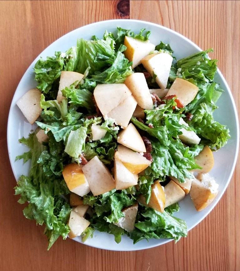 This recipe makes enough for 2 big portions of salad, which to me is a perfect lunch to share with your quarantine buddy (or just yourself!). Feel free to double this recipe for a family of 4, or half it for one big serving. Use your favorite swaps if goat cheese isn’t your favorite (feta would be great here!), or if you’re not a fan of traditional bacon (turkey bacon will do, as will your favorite vegan bacon alternative). Any leafy greens will work (baby spinach, any lettuce, arugula – it’ll all be great!), and the Asian pear can be swapped with an apple or a pear.