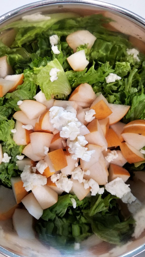 Lettuce, Asian pears, and goat cheese in!