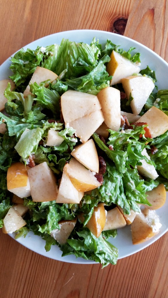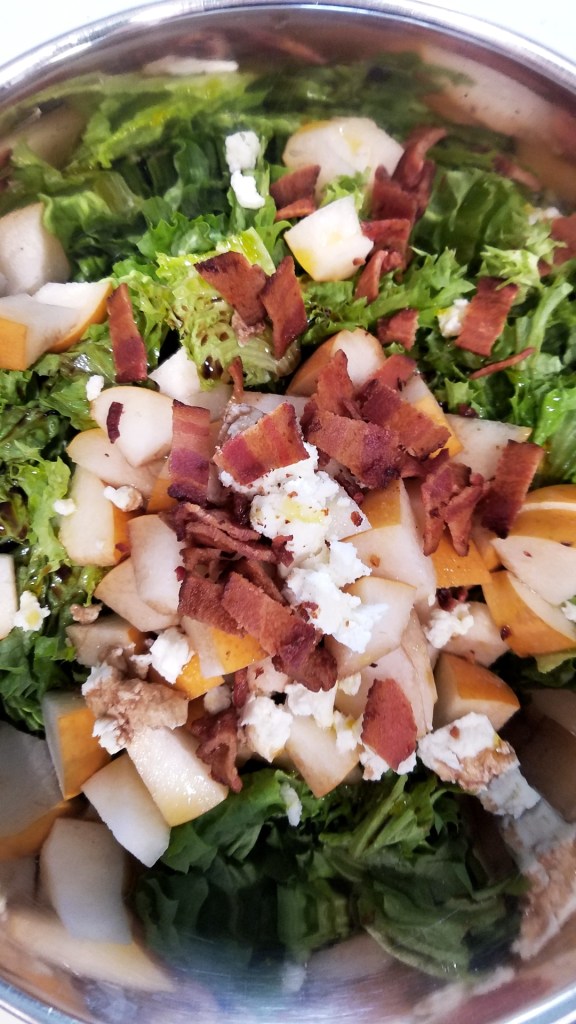 Leafy Green Salad with Asian Pear, Bacon, and Goat Cheese: