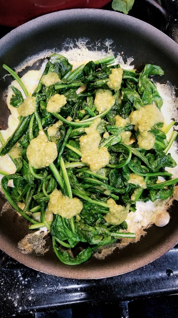 - In a large sauté pan, add half of the oil and put the pan over medium high heat to warm up for about 30 seconds. Add the prepped greens to the pan, and use tongs to toss and stir until all of the greens are fully cooked and wilted, about 2-5 minutes. Once the greens are fully wilted, take them out of the pan and allow them to rest on a clean plate.