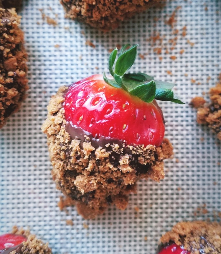 - Once fully dipped in chocolate, gently dip and swirl the strawberry into the speculoos cookie crumbs to coat the chocolate in a full layer of cookie crumbs. Move to the prepared Silpat or parchment paper.