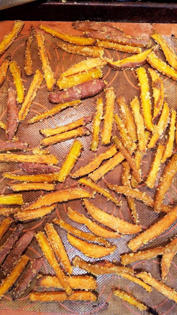 - For the sweet potatoes, cut into sticks approximately 4 inches in length and ½ inch thick. Place chopped sweet potatoes in a large bowl, set aside.