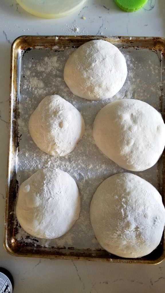 I’m not going to post the recipe that we use for the dough because it doesn’t appear to be publicly available online, and I don’t want to take credit for a recipe that is not mine.  The recipe that we use is published in the book Flour Water Salt Yeast by Ken Forkish.  He also has a whole book about pizza called The Elements of Pizza which looks like a lot of fun, and his website and YouTube page have a lot of fun content about pizza and bread making.  Click on all of those links to check out Ken’s recipes for more information and inspiration!
