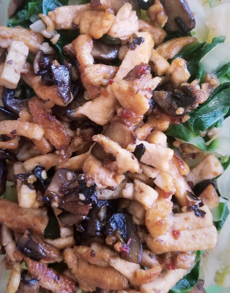 This recipe was inspired by a scroll session through Bon Appetit, where I found an article about grating firm tofu for lunch, and flavoring it with a simple sauce based on soy sauce and maple syrup. I took this recipe and ran with it, adding two portobello mushrooms to my block of tofu to bulk it up for meal-prep purposes, and customizing the sauce to items that I had in my pantry. The sauce is sweet and savory, and deeply flavors the tofu and mushrooms into a protein-packed topping that would work great on top of rice or other veggies. In the case of my meal prep this week, I used this recipe as a topper for some steamed cauliflower and sautéed bok choy. It stores and re-heats nicely for a grab-and-go lunch, and I’ve been looking forward to eating it every day.