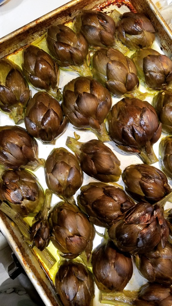 Raw artichokes, cleaned and ready to be cooked. Chicken broth is below, with plenty of oil on top.