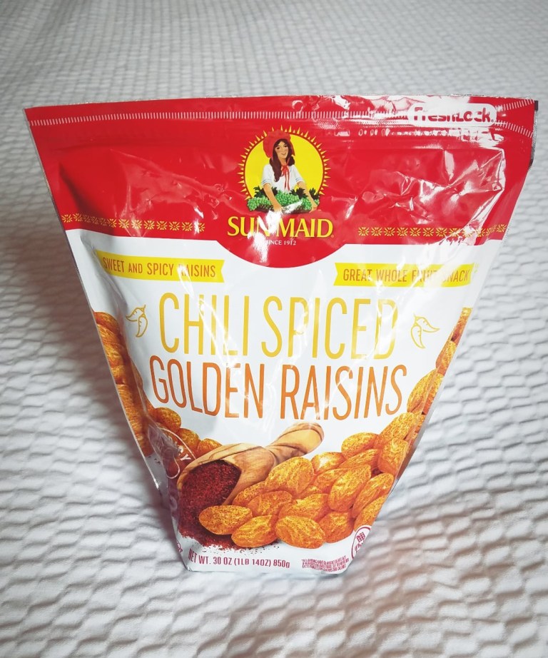 My parents were out visiting us here in sunny Southern California last weekend, which means we went to Costco on the daily, at every stop we went to (what can I say, my parents love a Costco!). After the first few trips of eying these chili spiced golden raisins, we finally broke down and bought a pack – which, my friends, was the right move.