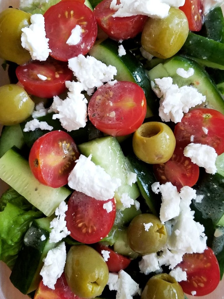 There are plenty of options here to make this salad more personalized. Add pickled pepperoncini peppers for some briny spice! Use different olives for color and flavor. Dice up a large tomato instead of the cherry tomatoes. Swap the lettuce for peppery arugula or nutrition-packed spinach or baby kale. Swap the feta for any of your other favorite cheeses. Add more protein by topping with chickpeas, sunflower seeds, or grilled chicken. Change out the Italian dressing for oil and vinegar, or your favorite vinaigrette. This version of Greek salad is onion and bell pepper free, but feel free to add those as well for a more authentic version (I’m personally not a huge raw onion or raw bell pepper fan, which is why they’re not here in my salad!). With salads, the world is your oyster, and all toppings are a go!