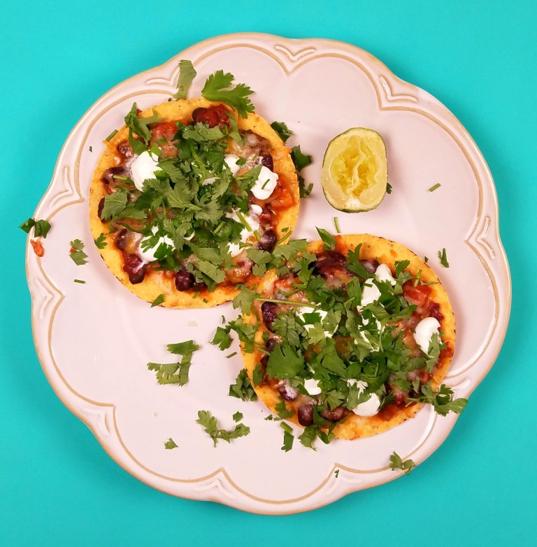 Recipe down below, photo up top! I dressed these up with all of my leftover chili fixings, but feel free to use whatever your favorite chili toppings are. Mix and match with the toppings to give different flavors to each tostada (if that’s what you’re into), or make them all fully loaded with everything for maximum fun (which is my personal approach). Recipe below is enough for 1 tostada, but feel free to repeat and scale up for as many tostadas as you want to make! I usually eat 2-3 per meal, depending on how hungry I am.