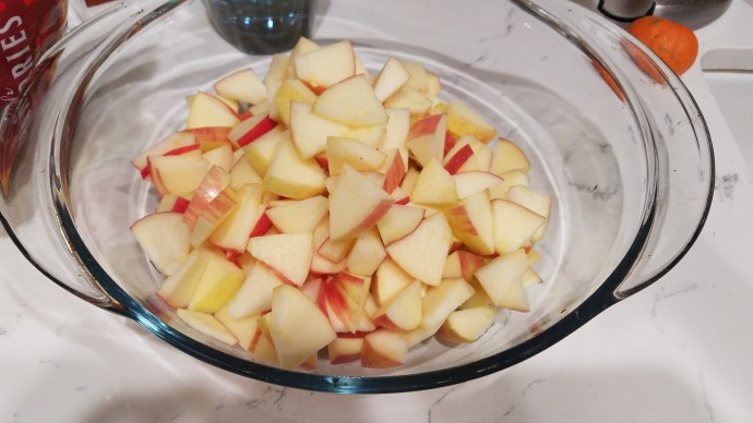 - Wash and core the apples by cutting them into quarters (lengthwise) and removing the inner core with either a knife or an apple corer. From there, chop the apple quarters in half (lengthwise) and chop the halves (cross-wise) into quarter inch slices. Place the diced apples into a large baking dish.