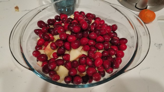 - Rinse the cranberries, and remove or discard any berries that are soft, moldy, or mushy. Place all of the good berries into the baking dish with the apples.