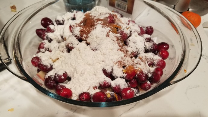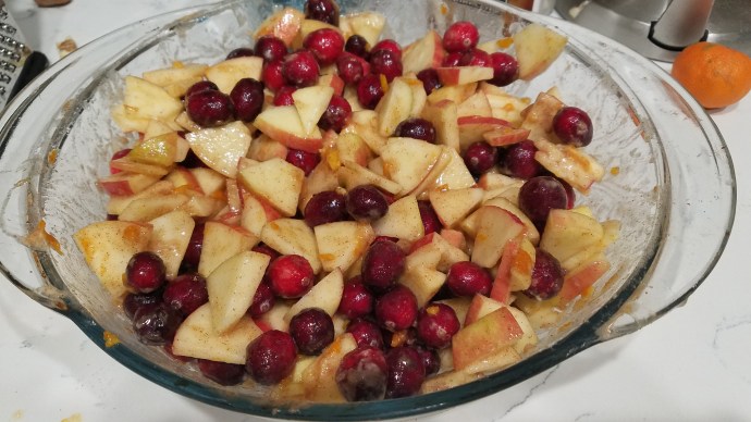 - Using a microplane grater, remove the zest from one orange, and add that to the bowl with the apples and cranberries. Cut the orange in half, and squeeze the juice of both halves of the orange into the baking dish as well.