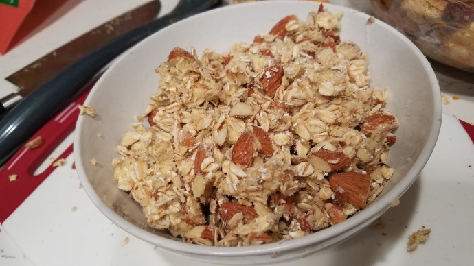 - In a mixing bowl, add the oats, sugar, almonds (chopped), and salt.