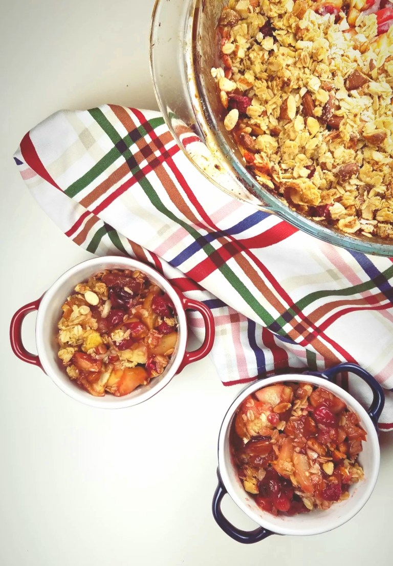 Apple crumble of some form or another has been on the weekly rotation in my house for the past few weeks. Apples are abundant this time of year, and nothing makes me feel more in the fall spirit than donning my favorite flannel and snuggling up to a warm piece of apple crumble. This week, I decided to make my crumble extra festive by adding cranberries for that ultimate seasonal charm, and I’m excited to share the recipe here on the blog for future holiday dessert inspiration!