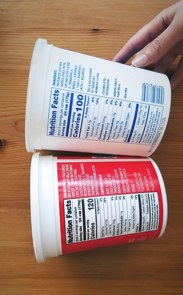 As for me, I’m pleased to report that the Trader Joe’s Goat Milk Yogurt has earned a place in my rotation of TJ’s dairy products, joining the ranks of classic staples like European Style Whole Milk Yogurt, the 4% Fat Whole Milk Cottage Cheese, and the Whole Milk Greek Yogurt (we go through a lot of dairy in this house!). I did a quick nutrition comparison to the European Style Yogurt, and learned that the Goat Milk Yogurt is actually slightly lower in calories (100 vs 120), slightly lower in fat (4.5g vs 5g), and just slightly lower in protein (6g vs 7g) and calcium (280mg vs 170mg) than it’s cow milk yogurt companion. I personally don’t feel like these differences are significant enough to choose one over the other, but wanted to share in case people are interested. I’ll post the nutrition fact and ingredient comparisons in the pictures below to serve as a reference if anyone is curious!