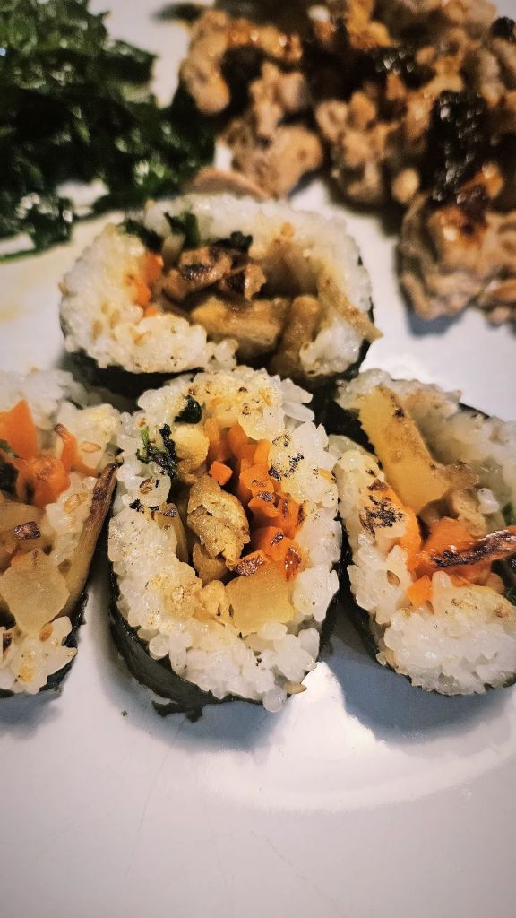 The roll is filled with sliced carrots, spinach, pickled veggies, and thinly sliced braised tofu, so it’s very veggie friendly. I really liked the fillings and I thought they all had a nice texture, and everything worked well with the warmed-up rice and seaweed wrapper. My one complaint about this roll is that it’s overall pretty bland in flavor, it needs a little extra sauce to make it pop. Even the Trader Joe’s website for this item admits to this (which I find pretty funny), so definitely serve with some soy sauce, chili crisp, gochujang, or your favorite teriyaki sauce. It’s very tasty with a little help from a flavorful friend!