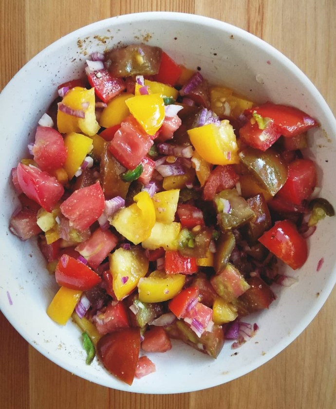 We currently have all of the ingredients to make salsa, either fresh from our local farm or harvested straight from the garden. Literally nothing could make me happier! For lunch, I made a beautiful garden …